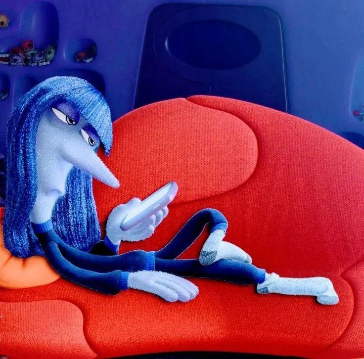 O personagem do tédio, todo monocromático, expressão facial neutra e em constante uso do celular reflete a falta de energia e desânimo tão característicos desse afeto. A origem da palavra tédio remonta à palavra grega akedia, vinda de kedos (“importar-se com”), ou seja, “não importar-se com”.